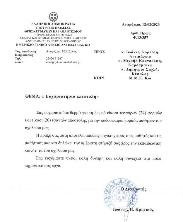 Εν Δωδεκανήσω ΓΕΛ Αντιμάχειας: Ευχαριστήριο για δωρεά στην ποδοσφαιρική ομάδα του σχολείου
