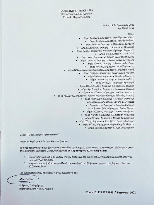 Επιστολή – πρόσκληση σε 29 Δημάρχους Κυκλάδων και Δωδεκανήσου απέστειλε ο Περιφερειάρχης Νοτίου Αιγαίου, με αντικείμενο τη συμμετοχή τους σε τηλεδιάσκεψη που θα πραγματοποιηθεί τη Δευτέρα 16 Φεβρουαρίου 2026 και ώρα 13:30.