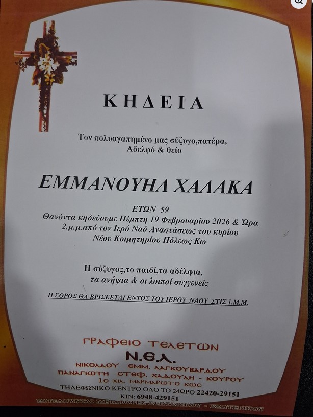 Η εξόδιος ακολουθία θα τελεστεί την Πέμπτη 19 Φεβρουαρίου 2026 και ώρα 2μμ από τον ΙΝ Αναστάσεως του Κυρίου στο νέο κοιμητήριο Κω.