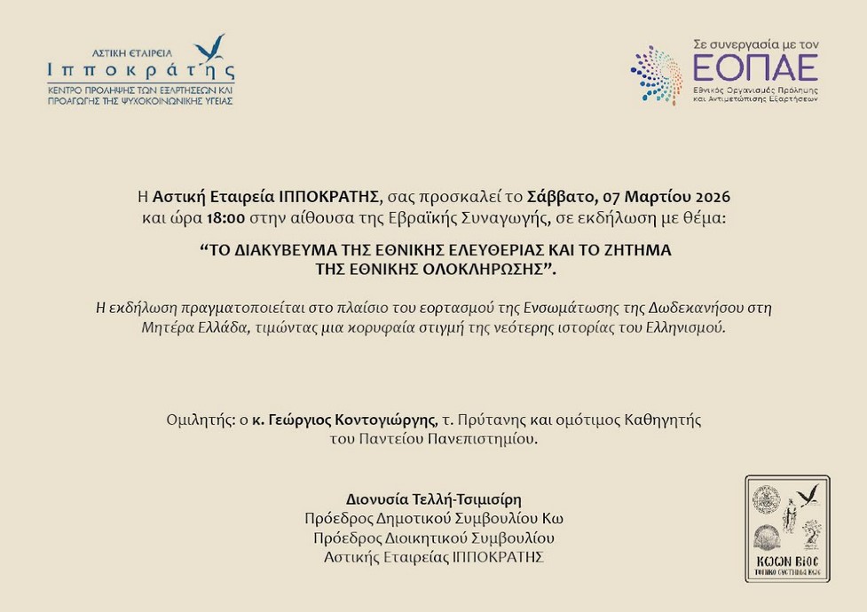 Πρόσκληση εκδήλωσης με θέμα: «ΤΟ ΔΙΑΚΥΒΕΥΜΑ ΤΗΣ ΕΘΝΙΚΗΣ ΕΛΕΥΘΕΡΙΑΣ ΚΑΙ ΤΟ ΖΗΤΗΜΑ ΤΗΣ ΕΘΝΙΚΗΣ ΟΛΟΚΛΗΡΩΣΗΣ”, που θα πραγματοποιηθεί το Σάββατο 7 Μαρτίου 2026 και ώρα 18:00, στην αίθουσα της Εβραικής Συναγωγής (Χάβρα).
