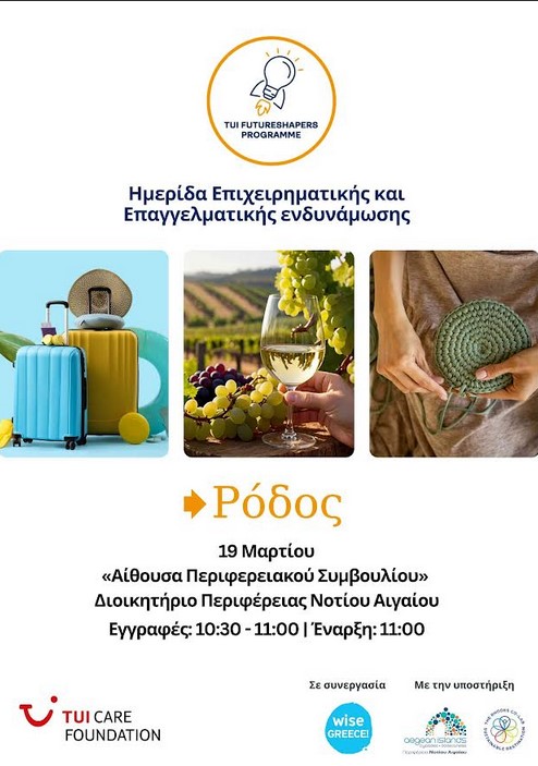 Η Περιφέρεια Νοτίου Αιγαίου, στο πλαίσιο των πρωτοβουλιών της για την ενίσχυση της τοπικής επιχειρηματικότητας και την υποστήριξη των επαγγελματιών της περιοχής, φιλοξενεί και υποστηρίζει την Ημερίδα Επιχειρηματικής και Επαγγελματικής Ενδυνάμωσης, που διοργανώνει η Wise Greece, με την υποστήριξη του TUI Care Foundation και σε συνεργασία με το The Rhodes Co-Lab Sustainable Destination.