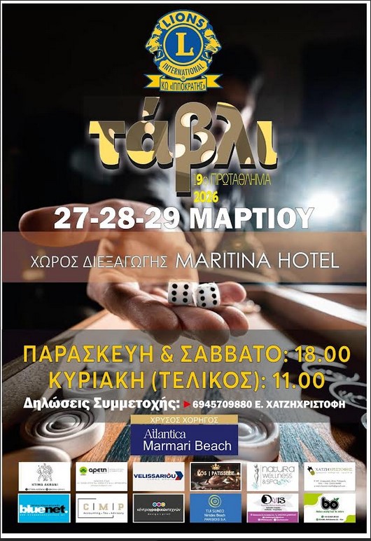 Για 19η χρονιά η Λέσχη Lions Κω «Ο Ιπποκράτης» διοργανώνει Πρωτάθλημα Τάβλι στην αίθουσα του Ξενοδοχείου ΜΑΡΙΤΙΝΑ το 3ήμερο 27-29 Μαρτίου.