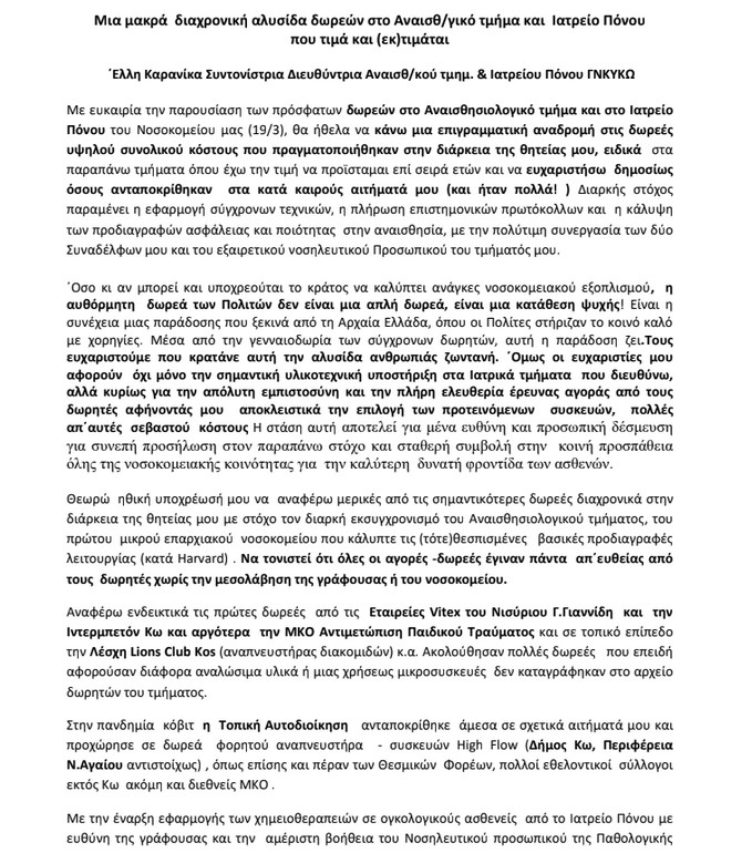 ΕιδήσειςΕν Δωδεκανήσω Έλλη Καρανίκα: Μια μακρά διαχρονική αλυσίδα δωρεών στο Αναισθησιολογικό τμήμα και Ιατρείο Πόνου που τιμά και (εκ)τιμάται Από aegeanews - 20 Μαρ 2026 0 44 Κοινοποίηση στο Facebook Μοιραστείτε στο X