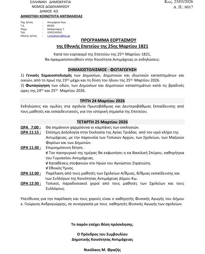Ατζέντα ΕκδηλώσεωνΕιδήσειςΕν Δωδεκανήσω Αντιμάχεια: Πρόγραμμα εορτασμού Εθνικής επετείου 25ης Μαρτίου 2026 Από aegeanews - 24 Μαρ 2026 0 16 Κοινοποίηση στο Facebook Μοιραστείτε στο X
