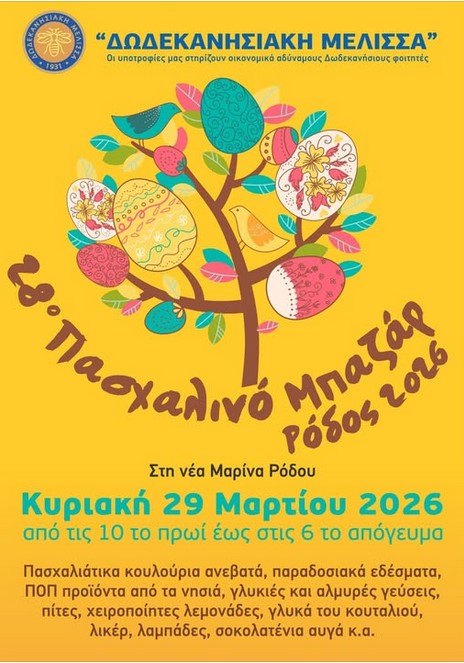Ατζέντα ΕκδηλώσεωνΕιδήσειςΕν Δωδεκανήσω Δωδεκανησιακή Μέλισσα: Πασχαλινό μπαζάρ στη νέα μαρίνα Ρόδου Από aegeanews - 26 Μαρ 2026 0 4 Κοινοποίηση στο Facebook Μοιραστείτε στο X Η διαχρονική σας στήριξη και ανταπόκριση σε κάθε κάλεσμα της Δωδεκανησιακής Μελισσας μας συγκινεί ιδιαίτερα και ανυπομονούμε να σας καλωσορίσουμε και φέτος κοντά μας