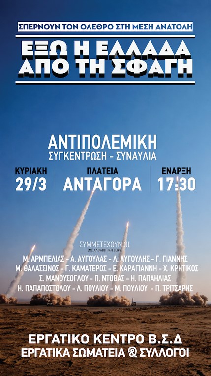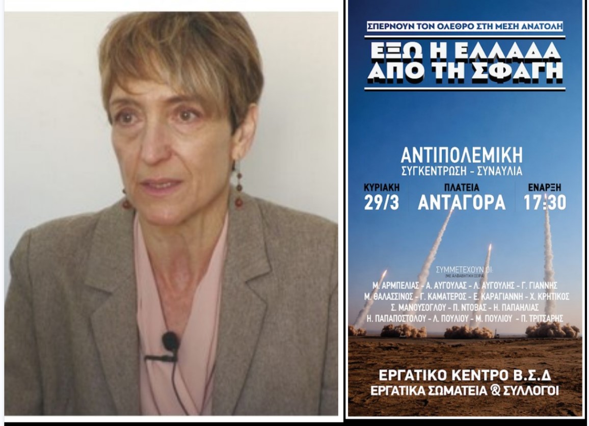 Την πρωτοβουλία για τη διοργάνωση μεγάλης αντιπολεμικής συγκέντρωσης και συναυλίας την προσεχή Κυριακή στις 17:30 στην πλατεία Διαγόρα, ανακοίνωσε η Αντιπρόεδρος του Εργατικού Κέντρου ΒΣΔ, Κική Μακρή. Με κεντρικό σύνθημα «Έξω η Ελλάδα από τον πόλεμο – Να μην πληρώσουμε εμείς τον πόλεμό τους», το Εργατικό Κέντρο μαζί με σωματεία του δημόσιου και ιδιωτικού τομέα καλούν τον λαό του νησιού σε μαζική συμμετοχή.