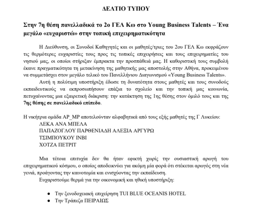 Στην 7η θέση πανελλαδικά το 2ο ΓΕΛ Κω στο Young Business Talents – Ένα μεγάλο «ευχαριστώ» στην τοπική επιχειρηματικότητα