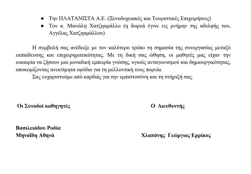 Μέσα από αυτό το Δελτίο Τύπου, η Διεύθυνση, οι καθηγητές και οι μαθητές εκφράζουν ένα τεράστιο «ευχαριστώ» στις τοπικές επιχειρήσεις και τους ανθρώπους της Κω. Η δική τους έμπρακτη και καθοριστική στήριξη ήταν αυτή που έκανε πραγματικότητα το ταξίδι της ομάδας «ΑΡ_ΜΡ» στην Αθήνα για τον μεγάλο τελικό.