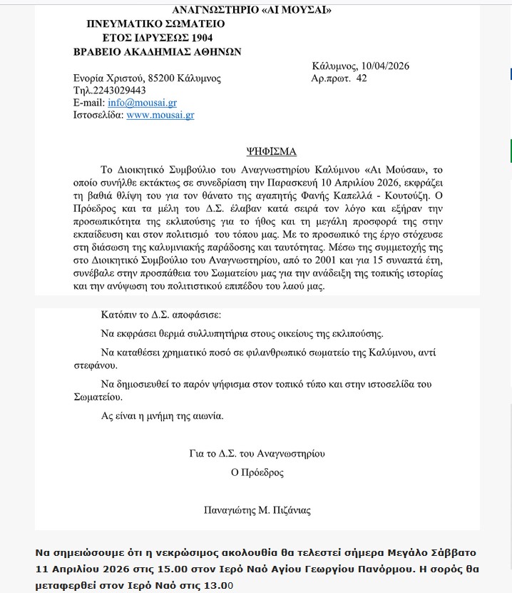 Εν Δωδεκανήσω Κάλυμνος: Ψήφισμα του Αναγνωστηρίου “ΑΙ ΜΟΥΣΑΙ” για το θάνατο της Φανής Καπελλά-Κουτούζη