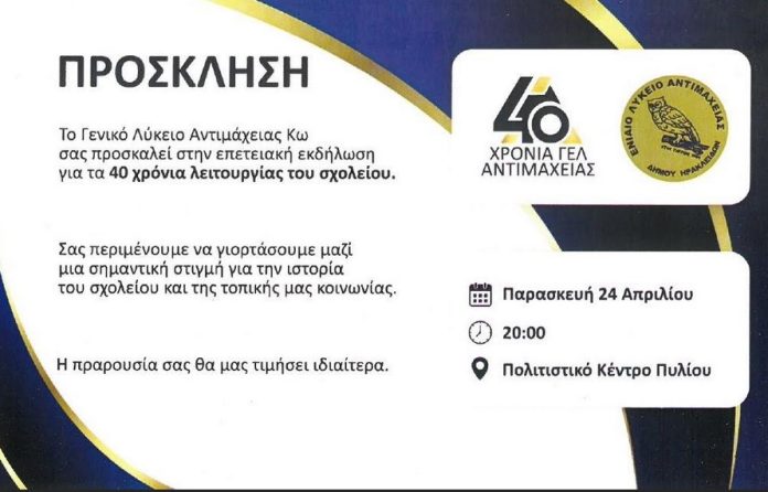 Ατζέντα ΕκδηλώσεωνΕιδήσειςΕν Δωδεκανήσω Ο Δήμαρχος Κω και το Ημερήσιο ΓΕΛ Αντιμάχειας Κω σας προσκαλούν να γιορτάσουμε μαζί τα 40 χρόνια λειτουργίας του σχολείου Από aegeanews - 21 Απρ 2026 0 16 Κοινοποίηση στο Facebook Μοιραστείτε στο X Ο Δήμαρχος Κω και το Ημερήσιο Γενικό Λύκειο Αντιμάχειας Κω σας προσκαλούν την Παρασκευή 24 Απριλίου 2026 και ώρα 8:00 μ.μ. στο Πολιτιστικό Κέντρο Πυλίου προκειμένου να γιορτάσουμε μαζί τα 40 χρόνια λειτουργίας του σχολείου μας.