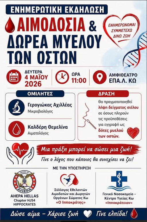 Το ΕΠΑΛ Κω διοργανώνει ενημερωτική εκδήλωση τη Δευτέρα 4 Μαΐου 2026 και ώρα 11:00 π.μ., με θέμα «Εθελοντική Αιμοδοσία και Δωρεά Μυελού των Οστών».