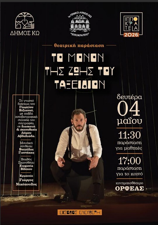 ΘΕΑΤΡΙΚΗ ΠΑΡΑΣΤΑΣΗ «ΤΟ ΜΟΝΟΝ ΤΗΣ ΖΩΗΣ ΤΟΥ ΤΑΞΕΙΔΙΟΝ» σε συνεργασία με το 1ο ΙΠΠΟΚΡΑΤΕΙΟ ΓΕΛ ΚΩ στο ΧΕΙΜΕΡΙΝΟ ΚΙΝΗΜΑΤΟΘΕΑΤΡΟ «ΟΡΦΕΑΣ» με ΕΙΣΟΔΟ ΕΛΕΥΘΕΡΗ
