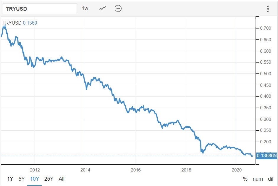 Το 2010 μια τουρκική λίρα άξιζε 72 σεντς του δολαρίου. Σήμερα η αξία της είναι περίπου 13. Το διάγραμμα είναι τόσο εντυπωσιακό όσο και «εύγλωττο»