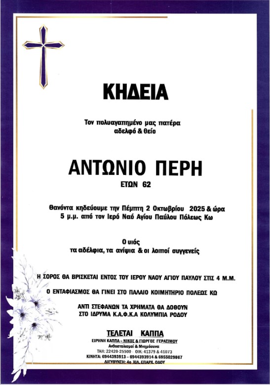 ΕιδήσειςΦήμες Αύριο Πέμπτη 5μμ το «τελευταίο αντίο» στον Αντώνη Περή στον ΙΝ Αγίου Παύλου Κω Από aegeanews - 1 Οκτ 2025 0 302 Κοινοποίηση στο Facebook Μοιραστείτε στο X Απέραντη θλίψη σκόρπισε στην Κω ο θάνατος του αγαπητού συμπολίτη μας Αντώνη Περή
