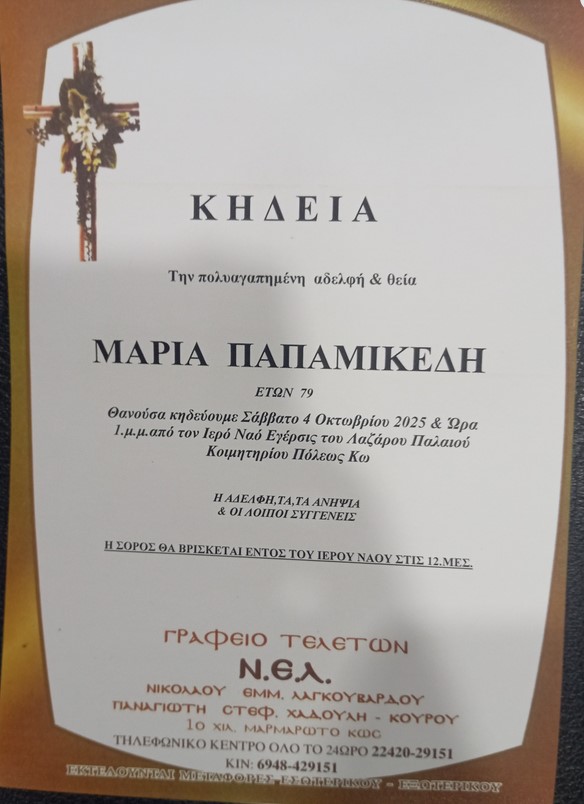 Η εξόδιος ακολουθία θα τελεστεί αύριο Σάββατο 04 Οκτωβρίου και ώρα 1μμ από το Ιερό κοιμητηριακό παρεκκλήσιο Εγέρσεως του Λαζάρου στο παλαιό κοιμητήριο Κω.