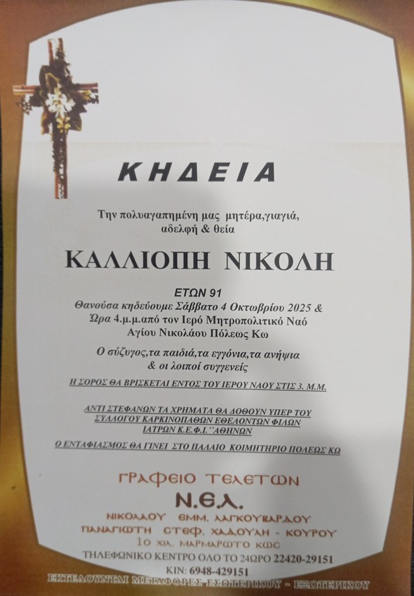 Η εξόδιος ακολουθία θα τελεστεί σήμερα Σάββατο 4 Οκτωβρίου 2025 και ώρα 4μμ από τον Ιερό Μητροπολιτικό ναό του Αγίου Νικολάου Κω.