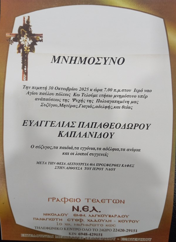 ΕιδήσειςΦήμες Αναγγελία μνημοσύνου Ευαγγελίας Παπαθεοδώρου Καπλανίδου Από aegeanews - 29 Οκτ 2025 0 22 Κοινοποίηση στο Facebook Μοιραστείτε στο X