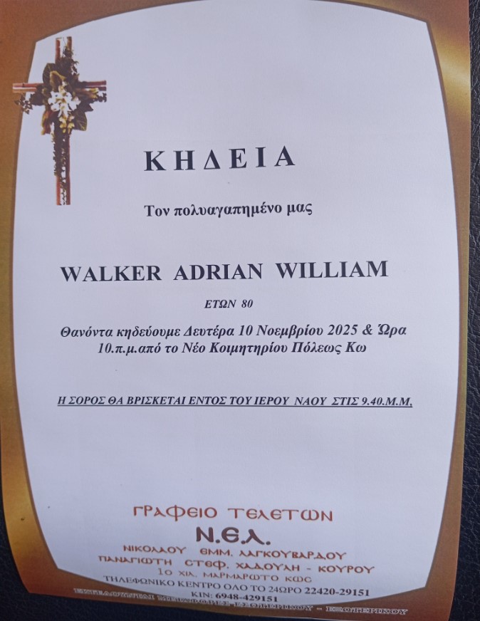 Η εξόδιος ακολουθία θα τελεστεί τη Δευτέρα 10 Νοεμβρίου 2025 και ώρα 10πμ στο νέο κοιμητήριο Κω.