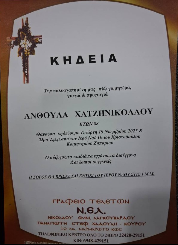 Η εξόδιος ακολουθία θα τελεστεί σήμερα Τετάρτη 19 Νοεμβρίου 2025 και ώρα 2μμ από τον Ιερό Κοιμητηριακό ναό του Οσίου Χριστοδούλου στο Ζηπάρι.