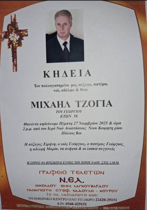 ΕιδήσειςΦήμες Αύριο Πέμπτη στις 2μμ στο νέο κοιμητήριο Κω το «τελευταίο αντίο» στον Μιχάλη Τζόγια Από aegeanews - 26 Νοέ 2025 0 52 Κοινοποίηση στο Facebook Μοιραστείτε στο X