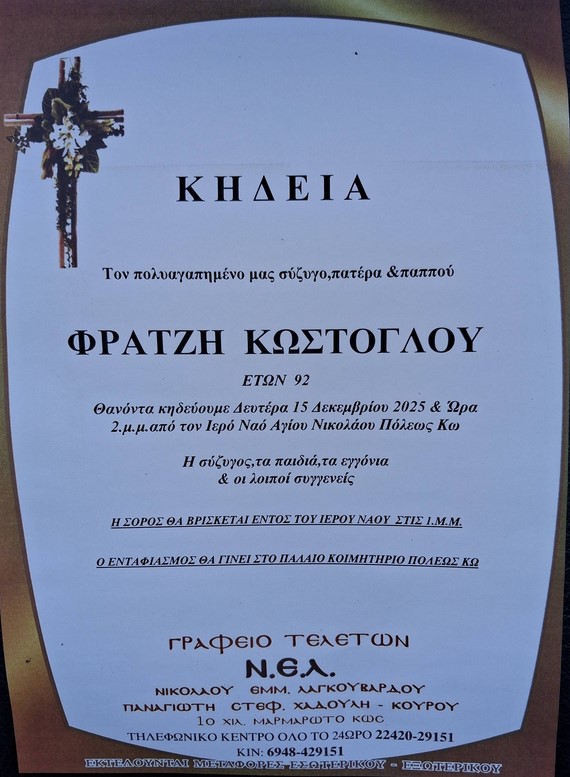 Η εξόδιος ακολουθία θα τελεστεί τη Δευτέρα 15 Δεκεμβρίου 2025 και ώρα 2μμ από τον ΙΝ Αγίου Νικολάου πόλεως Κω.