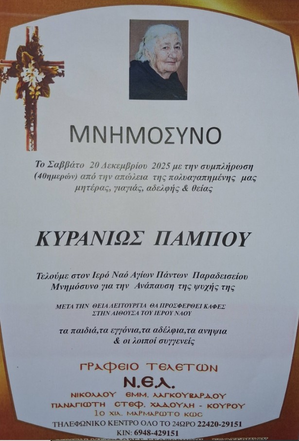 ΕιδήσειςΦήμες Αναγγελία μνημοσύνου Κυρανιώς Παμπού Από aegeanews - 18 Δεκ 2025 0 28 Κοινοποίηση στο Facebook Μοιραστείτε στο X