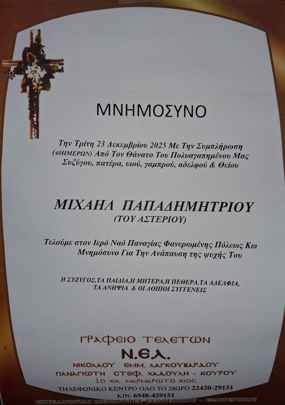 ΕιδήσειςΦήμες Αναγγελία μνημοσύνου Μιχαήλ Παπαδημητρίου Από aegeanews - 21 Δεκ 2025 0 37 Κοινοποίηση στο Facebook Μοιραστείτε στο X