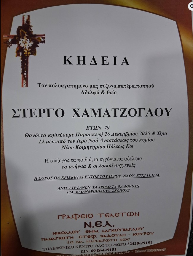 ΕιδήσειςΦήμες Το «τελευταίο αντίο» στον Στέργο Χαματζόγλου Παρασκευή στις 12 το μεσημέρι στο νέο κοιμητήριο Κω Από aegeanews - 25 Δεκ 2025 0 377 Κοινοποίηση στο Facebook Μοιραστείτε στο X