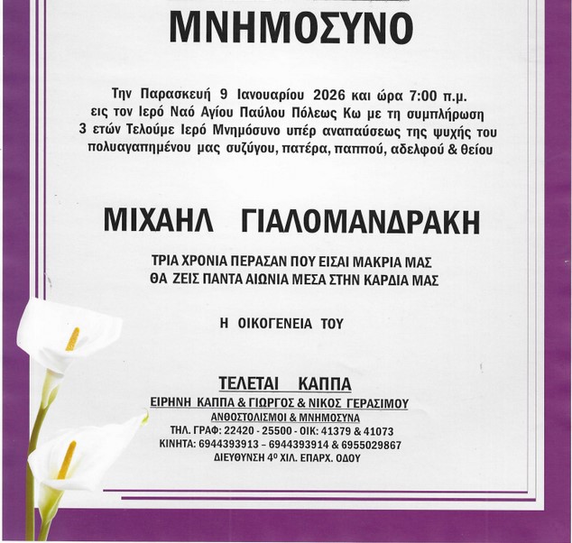 ΕιδήσειςΦήμες Αναγγελία μνημοσύνου Μιχαήλ Γιαλομανδράκη Από aegeanews - 6 Ιαν 2026 0 162 Κοινοποίηση στο Facebook Μοιραστείτε στο X