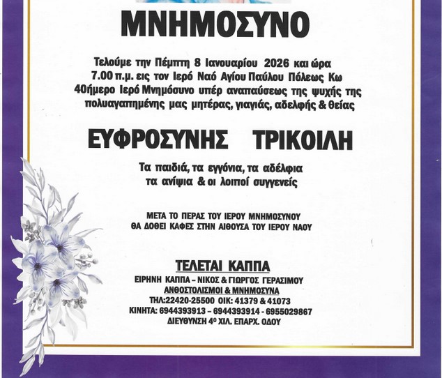 ΕιδήσειςΦήμες Αναγγελία μνημοσύνου Ευφροσύνης Τρικοίλη Από aegeanews - 5 Ιαν 2026 0 4612 Κοινοποίηση στο Facebook Μοιραστείτε στο X