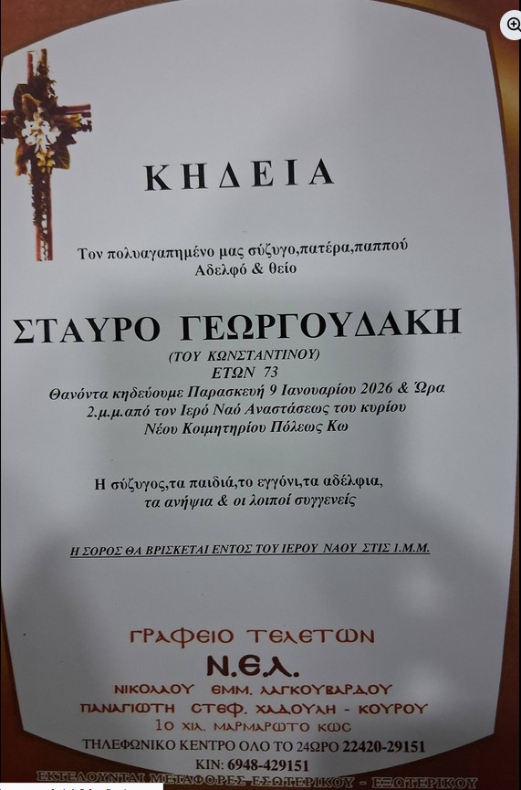 Η εξόδιος ακολουθία θα τελεστεί την Παρασκευή 09 Ιανουαρίου 2026 και ώρα 2μμ από τον ΙΝ Αναστάσεως του Κυρίου στο νέο κοιμητήριο Κω.