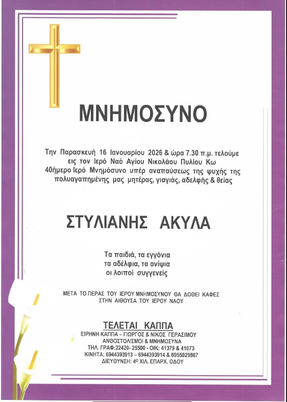 ΕιδήσειςΦήμες Αναγγελία μνημοσύνου Στυλιανής Ακύλα Από aegeanews - 14 Ιαν 2026 0 36 Κοινοποίηση στο Facebook Μοιραστείτε στο X