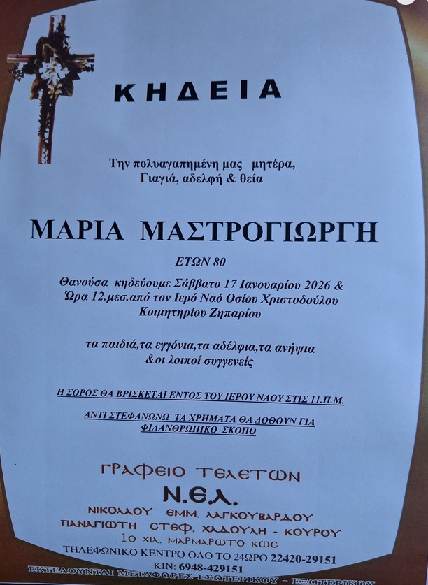 «Έφυγε» από τη ζωή η αγαπητή συμπολίτισσά μας Μαρία Μαστρογιώργη, το γένος Ματθαίου, σε ηλικία 80 ετών.