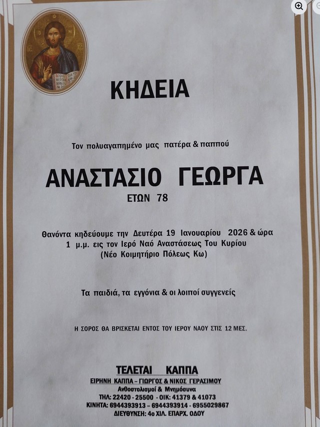 Η εξόδιος ακολουθία θα τελεστεί τη Δευτέρα 19 Ιανουαρίου 2026 και ώρα 13:00