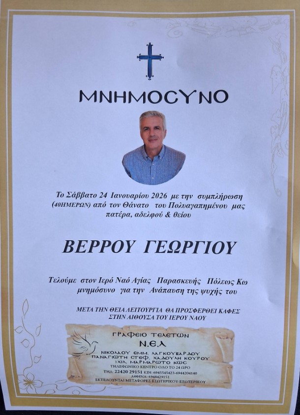 ΕιδήσειςΦήμες Αναγγελία μνημοσύνου Γεωργίου Βέρρου Από aegeanews - 21 Ιαν 2026 0 30 Κοινοποίηση στο Facebook Μοιραστείτε στο X