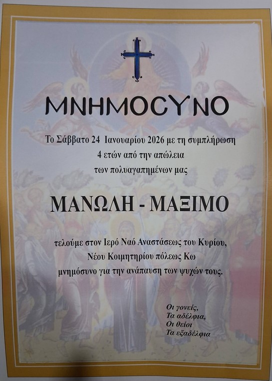 ΕιδήσειςΦήμες Αναγγελία μνημοσύνου Μανώλη και Μάξιμου Από aegeanews - 21 Ιαν 2026 0 32 Κοινοποίηση στο Facebook Μοιραστείτε στο X