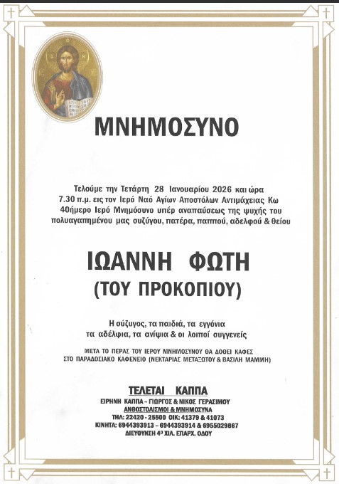 ΕιδήσειςΦήμες Αναγγελία μνημοσύνου Ιωάννη Φώτη του Προκοπίου Από aegeanews - 25 Ιαν 2026 0 16 Κοινοποίηση στο Facebook Μοιραστείτε στο X
