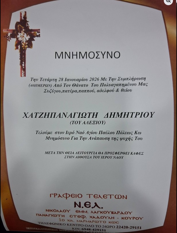 ΕιδήσειςΦήμες Αναγγελία μνημοσύνου Δημήτρη Χατζηπαναγιώτη Από aegeanews - 25 Ιαν 2026 0 77 Κοινοποίηση στο Facebook Μοιραστείτε στο X