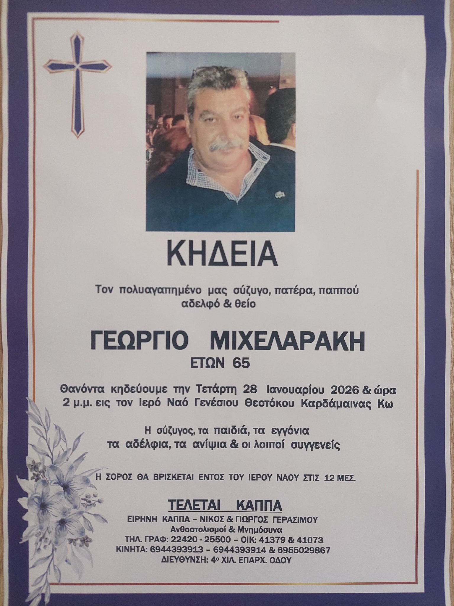 ΕιδήσειςΦήμες Την Τετάρτη στις 2μμ στον ΙΝ Γενεσίου Θεοτόκου Καρδάμαινας η εξόδιος ακολουθία για τον Γιώργο Μιχελαράκη Από aegeanews - 26 Ιαν 2026 0 287 Κοινοποίηση στο Facebook Μοιραστείτε στο X
