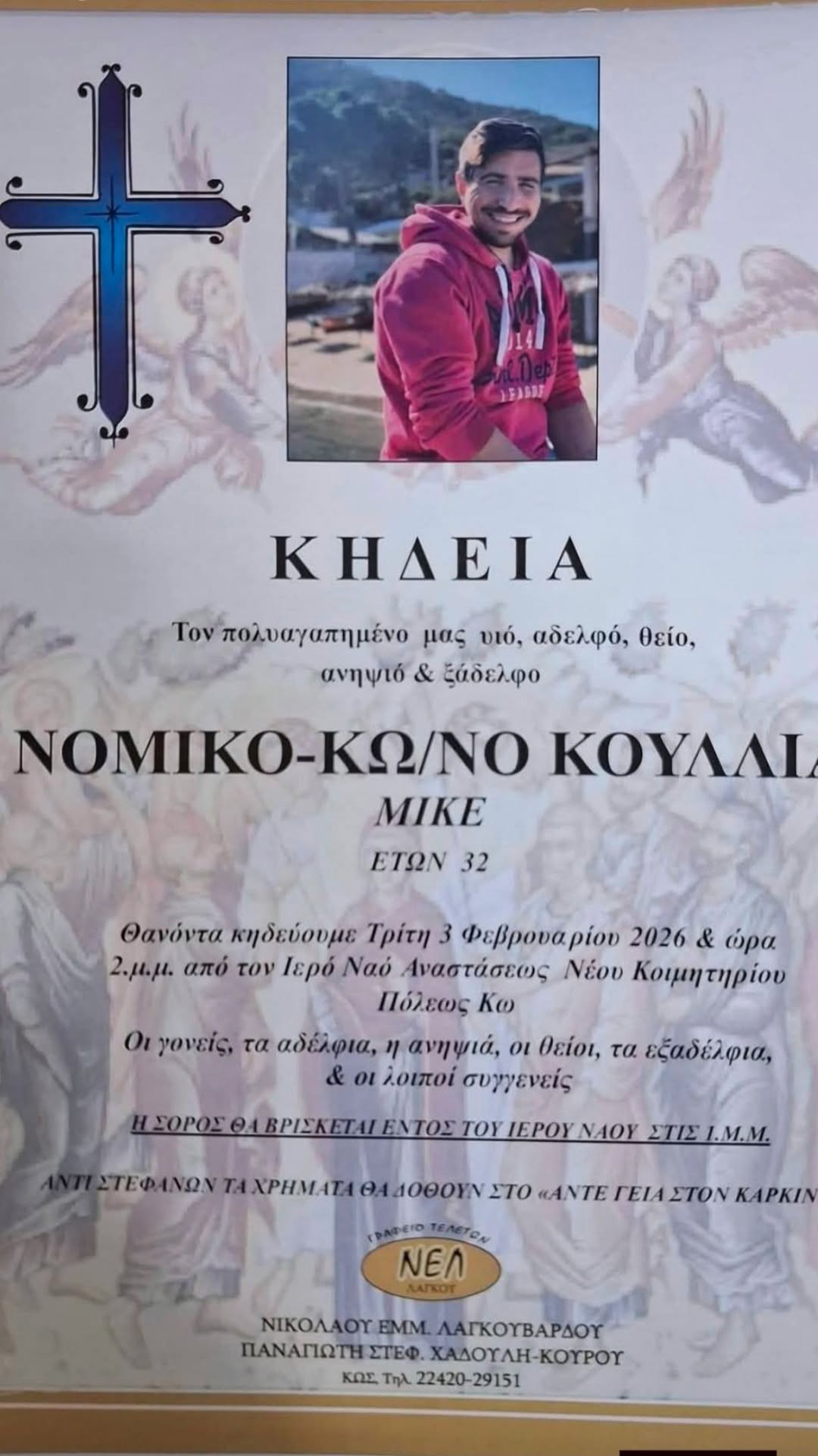 ΕιδήσειςΦήμες Το «τελευταίο αντίο» στον Μικέ Κουλλιά Τρίτη 2μμ στο νέο κοιμητήριο Κω Από aegeanews - 2 Φεβ 2026 0 73 Κοινοποίηση στο Facebook Μοιραστείτε στο X