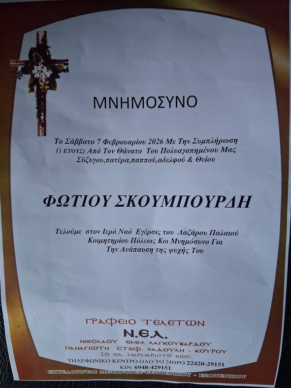 ΕιδήσειςΦήμες Αναγγελία μνημοσύνου Φώτη Σκουμπουρδή Από aegeanews - 5 Φεβ 2026 0 36 Κοινοποίηση στο Facebook Μοιραστείτε στο X