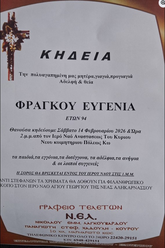 Η εξόδιος ακολουθία θα τελεστεί αύριο Σάββατο 14 Φεβρουαρίου και ώρα 2μμ από τον ΙΝ Αναστάσεως του Κυρίου στο νέο κοιμητήριο Κω.