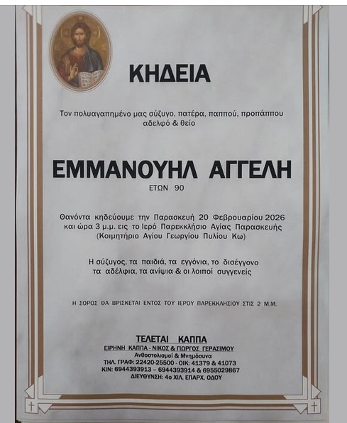 Η εξόδιος ακολουθία θα τελεστεί την Παρασκευή 20 Φεβρουαρίου 2026 και ώρα 3μμ από το Ιερό Παρεκκλήσιο Αγίας Παρασκευής (κοιμητήριο Αγίου Γεωργίου Πυλίου).