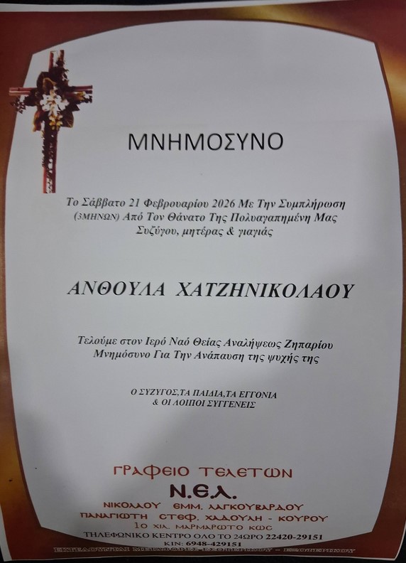 ΕιδήσειςΦήμες Αναγγελία μνημοσύνου Ανθούλας Χατζηνικολάου Από aegeanews - 19 Φεβ 2026 0 84 Κοινοποίηση στο Facebook Μοιραστείτε στο X