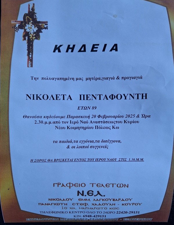 Η εξόδιος ακολουθία θα τελεστεί την Παρασκευή 20 Φεβρουαρίου και ώρα 2:30μμ από τον ΙΝ Αναστάσεως του Κυρίου στο νέο κοιμητήριο Κω.