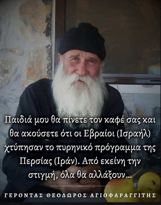 Συγκεκριμένα, ένας ασκητής, ο οποίος ήταν στην Κρήτη και ήταν άγνωστος στους πολλούς ο Γέρων Θεόδωρος – Νείλος ο Αγιοφαραγγίτης (εκοιμήθη 28 Απριλίου 2016) έλεγε: “Θα πίνετε τον καφέ σας και θα ακούσετε ότι οι Εβραίοι χτύπησαν το πυρηνικό πρόγραμμα της Περσίας”.