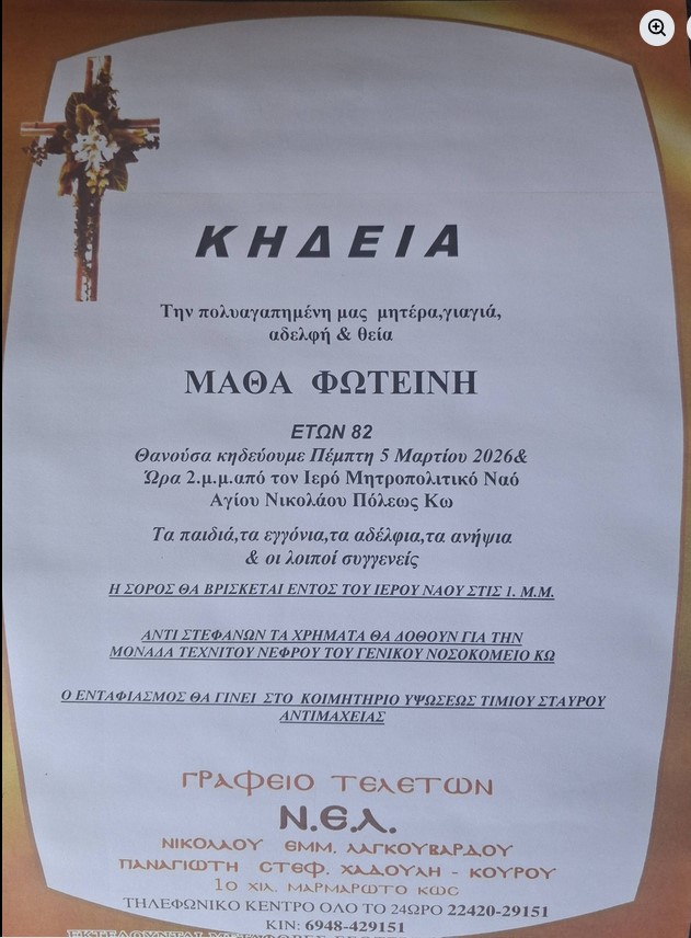 Η εξόδιος ακολουθία θα τελεστεί την Πέμπτη 5 Μαρτίου και ώρα 2μμ από τον Ιερό Μητροπολιτικό Ναό Αγίου Νικολάου Κω.