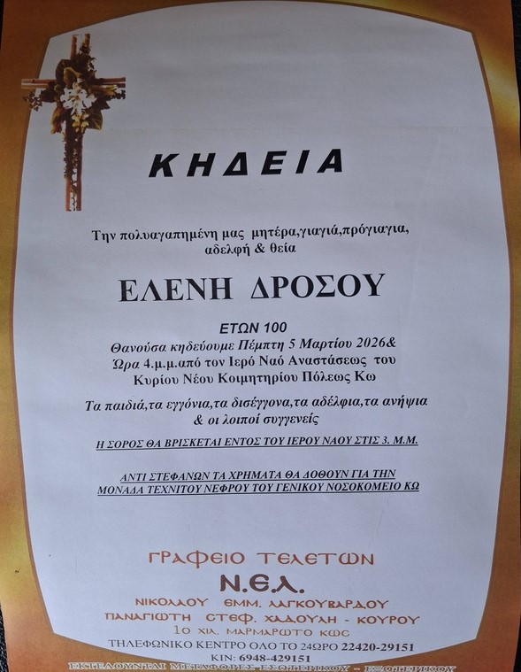 Με βαθιά συγκίνηση η κοινωνία της Κω αποχαιρετά την «κυρά Ελένη» Δρόσου το γένος Μαγκαφά, η οποία έφυγε από τη ζωή σε ηλικία 100 ετών, τo πρωί της Τετάρτης 4 Μαρτίου 2026 έχοντας διαγράψει μια πορεία ζωής γεμάτη αγάπη, οικογένεια, εργασία, θυσίες και αξιοπρέπεια.