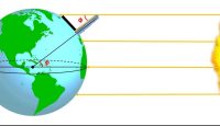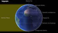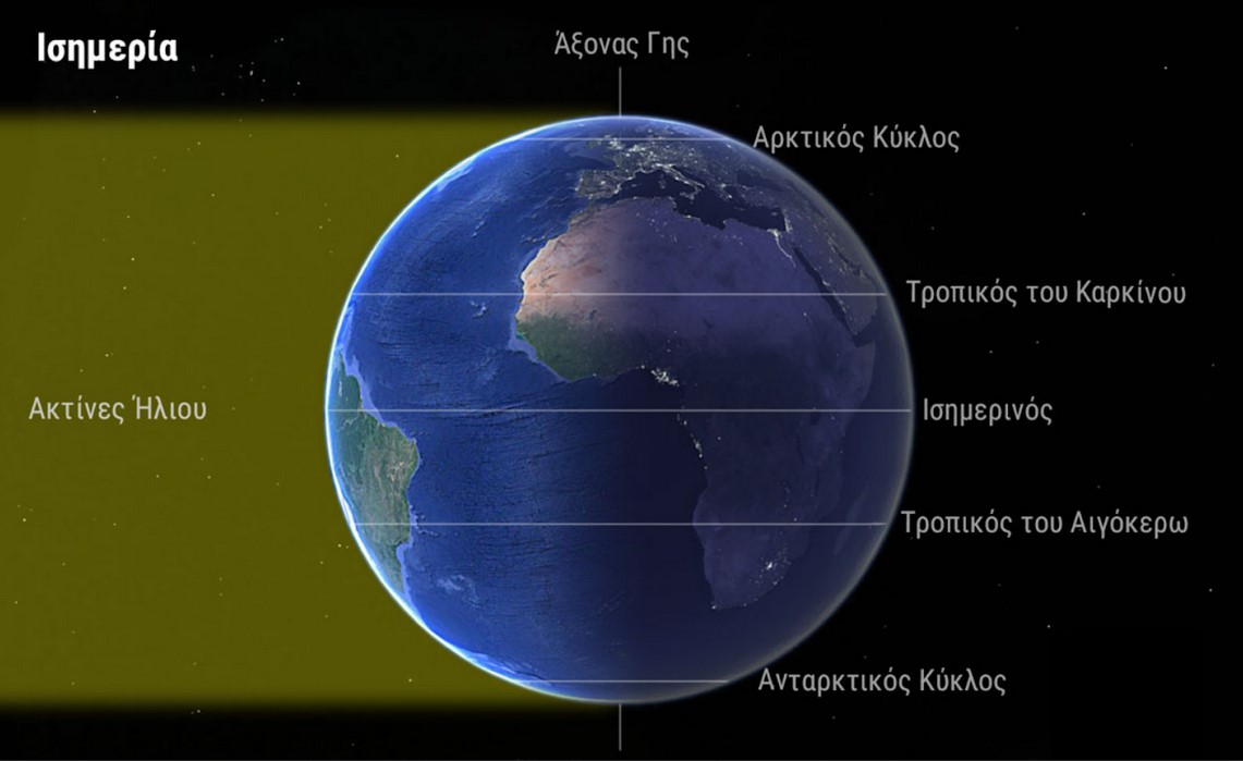 (Η εικόνα δείχνει γιατί η γωνία που σχηματίζουν οι ακτίνες του Ήλιου με την κατακόρυφο είναι ίση με το γεωγραφικό πλάτος τη στιγμή της Εαρινής Ισημερίας).