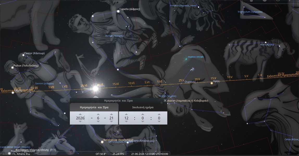 - Σήμερα (21 Ιουνίου 2026): Παρόλο που ονομάζουμε τη μέρα αυτή «είσοδο στον Καρκίνο», η αστρονομική πραγματικότητα στο Stellarium δείχνει τον Ήλιο να βρίσκεται ακόμα στα όρια μεταξύ των αστερισμών των Διδύμων και του Ταύρου.